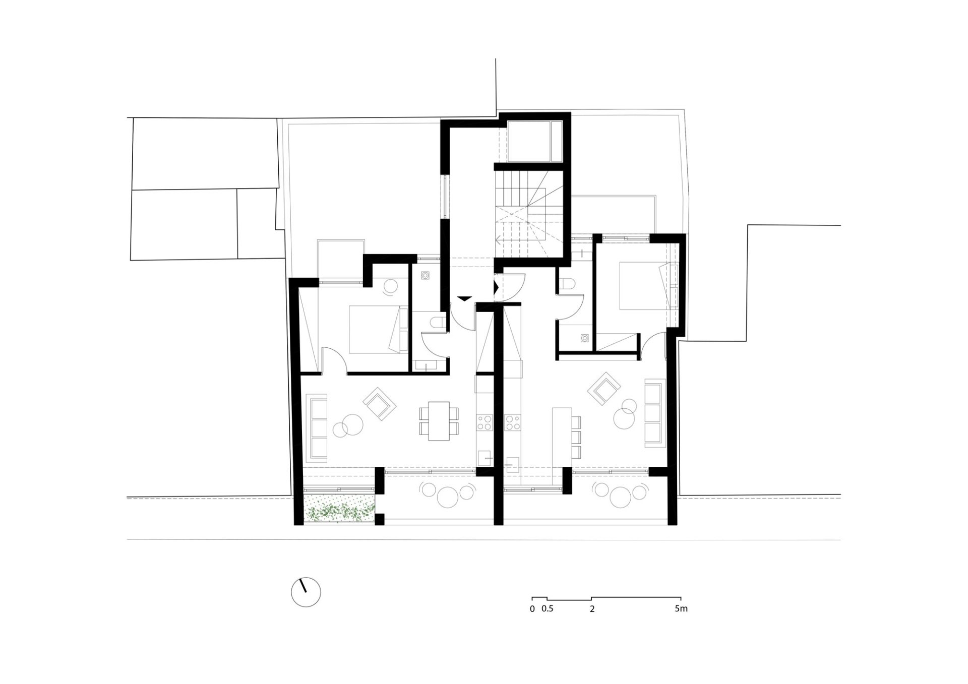 Εσωτερικά η διαμερισμάτωση των κατοικιών επιτυγχάνεται με το σχεδιασμό ενός ξύλινου όγκου που εγκιβωτίζει τους ιδιωτικούς χώρους (υπνοδωμάτιο – λουτρό) αφήνοντας τους χώρους διημέρευσης να οργανωθούν ελεύθερα έξω από αυτό (καθιστικό – κουζίνα).