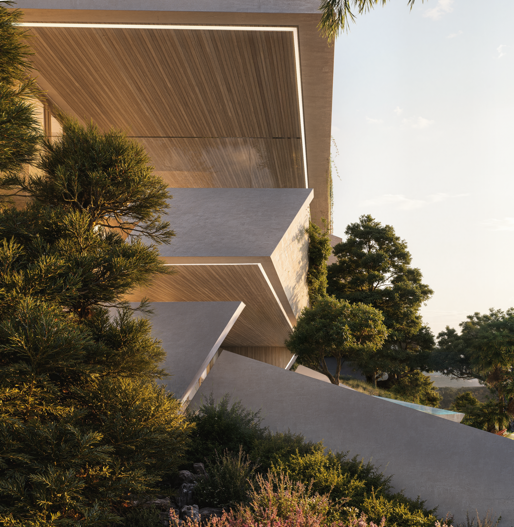 Στο χαμηλότερο επίπεδο, η πισίνα-καθρέφτης αναπτύσσεται γραμμικά παράλληλα με το κτίριο, αποτελώντας βασικό στοιχείο της χωρικής εμπειρίας. Η αντανάκλαση του φωτός και των όψεων στο νερό ενισχύει την αίσθηση ηρεμίας και πολυτέλειας, ενώ η ένταξή της στο τοπίο δημιουργεί μια ομαλή μετάβαση ανάμεσα στην αρχιτεκτονική και το φυσικό περιβάλλον.